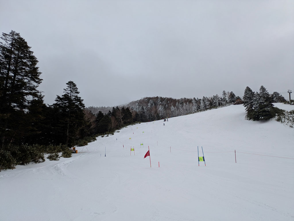 雨が降るほど気温が高めだったのですが、人工降雪機を使って雪を作って下さっていたので、表面は柔らかくてもその下にはそこそこ硬いバーンになっていて雨でしたが良いトレーニングが出来たのではないかと思います。