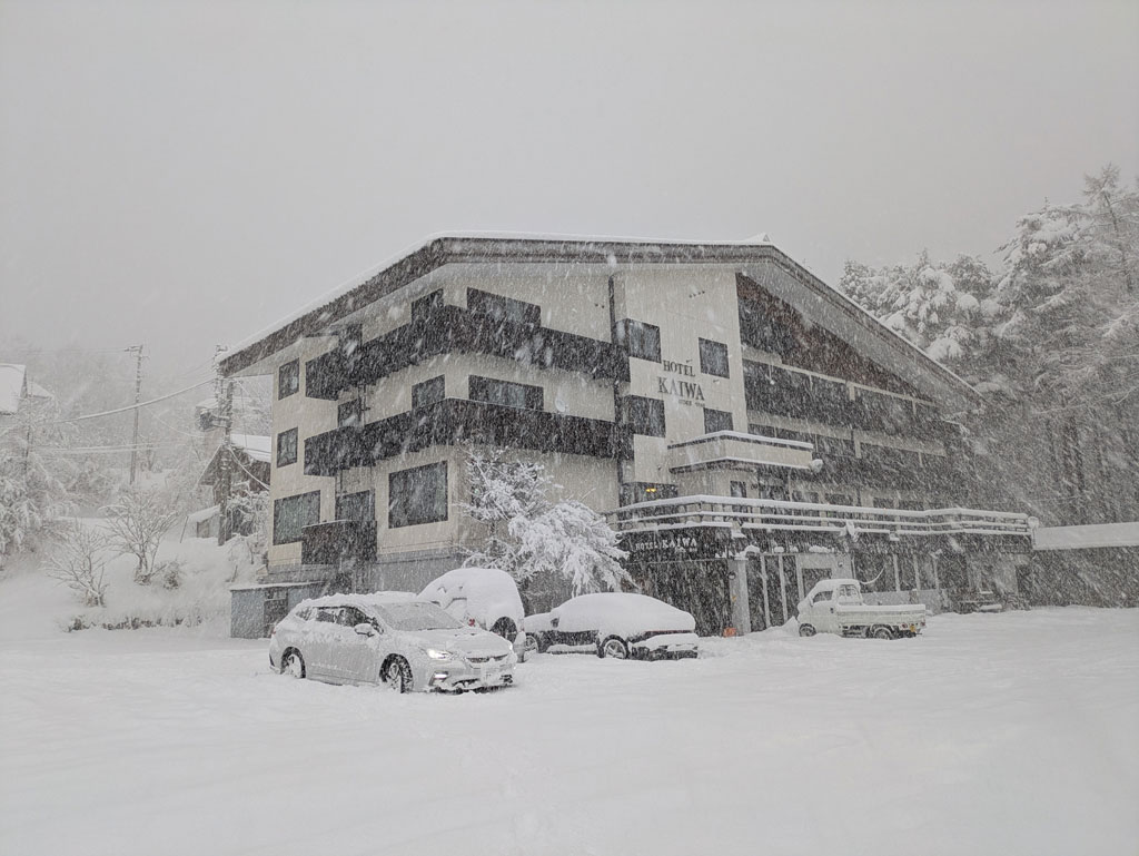 朝起きて「ホテルカイワ」前で気温は-2℃まで下がり、降雪量は15cm位でした!!