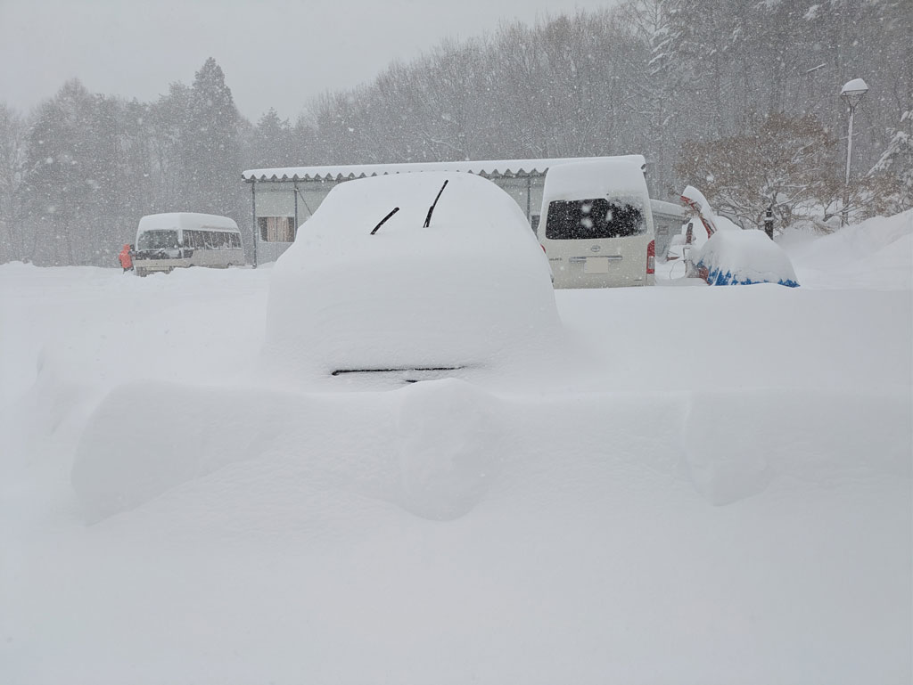 トレーニングが終わり遅めの昼食を食べて積雪量は「ホテルカイワ」前で40~50cm