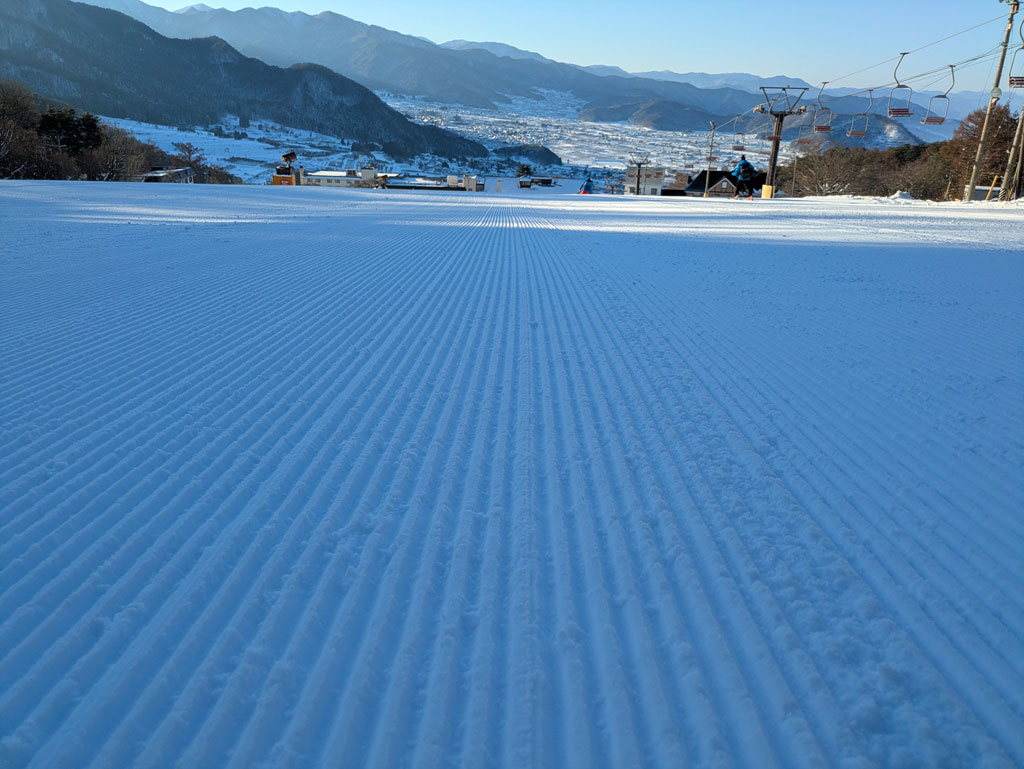 朝イチポールセットに行ってみると、整備して頂き全体的に締まって条件が良くなったものの、締まった分雪の厚みは減っていました。