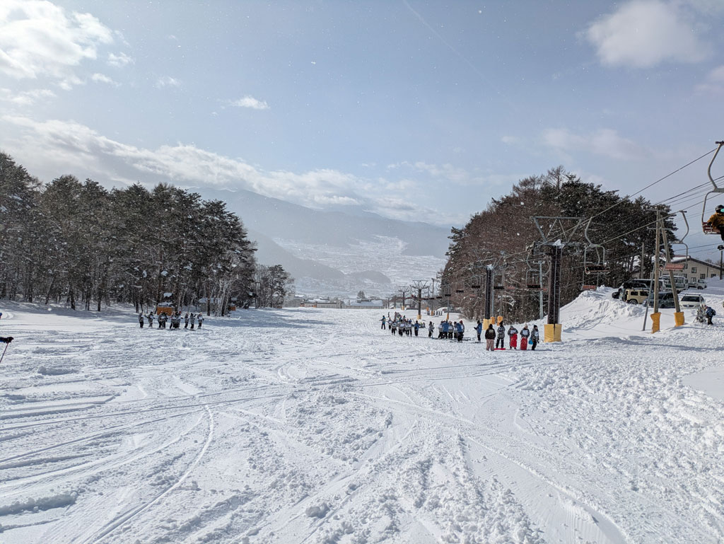 経験班は1班のみで未経験の方が9割、初めて乗るリフトに乗車中も黄色い声が聞こえて賑やかな感じです(*^_^*)