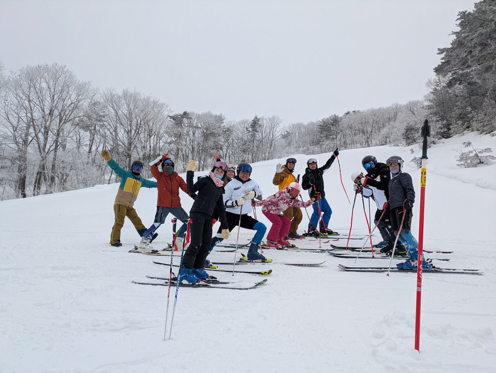 集合写真は朝イチの集合に間に合ったスキーの参加者と、昼食後今回の合宿の参加者になります。