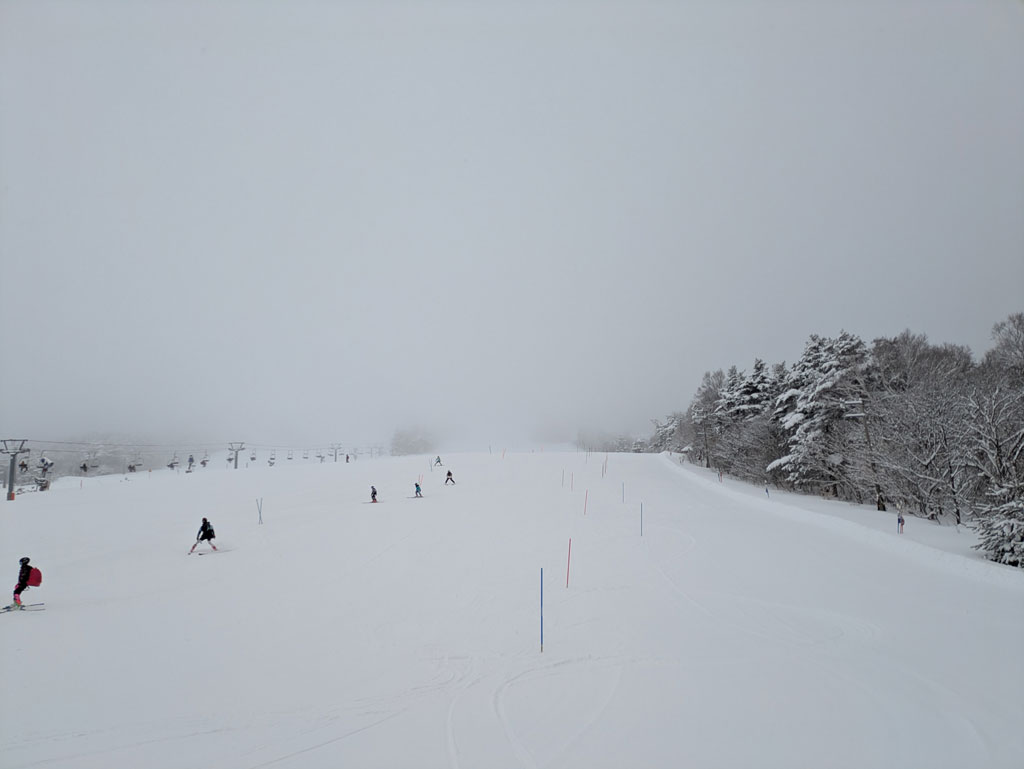 冷えているので雪の粒が小さめでサラサラのパウダーで、天気が良ければ気持ち良くパウダーを滑れたと思いますが、10時前後までは曇り!!
