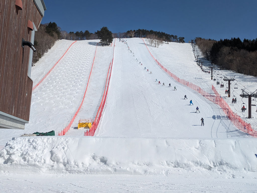 見た目的には最低気温が下がって硬そうに見えたものの、晴れていて視界が良い事と晴れて表面が多少緩んだのか、朝一から良い滑りの人が多く、昨日とは全く違う感じ!!