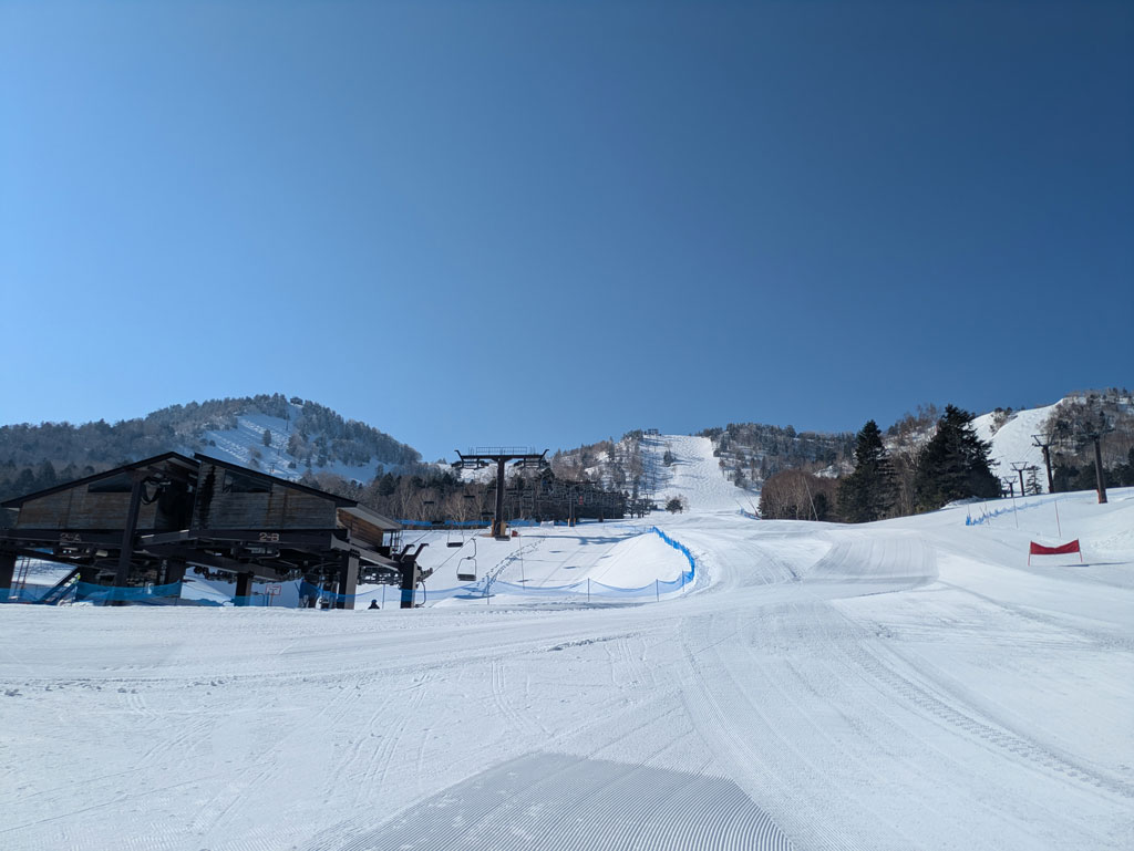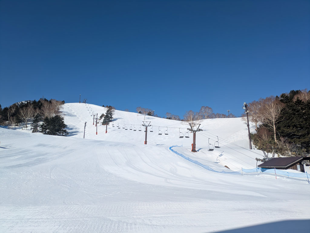 写真は例年よりは少ないものの、まだまだゲレンデコンディションすこぶる良好な「熊の湯スキー場」