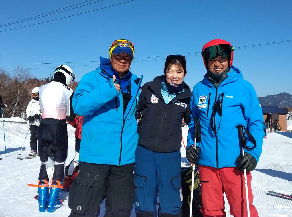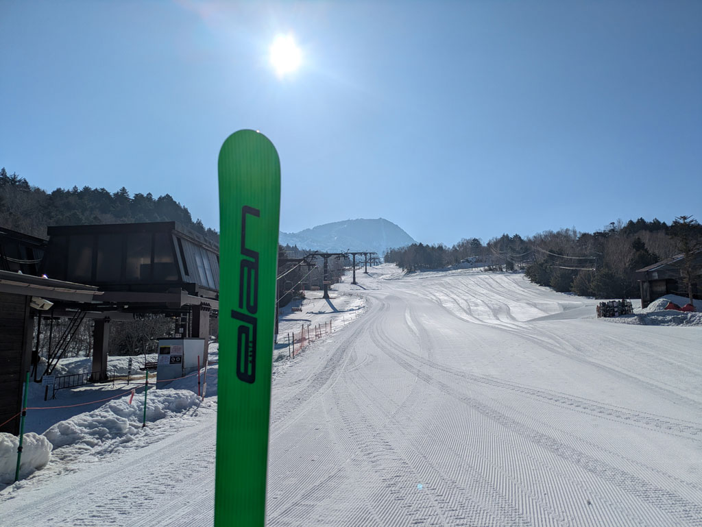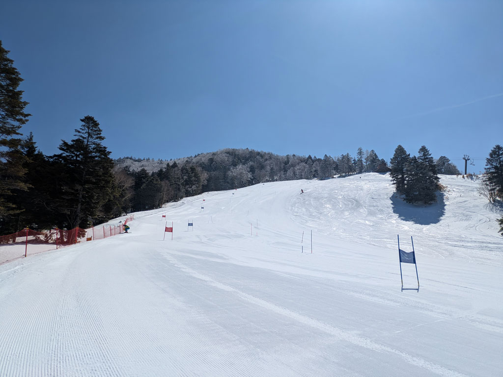 写真は快晴の「横手山スキー場」、今回海外のチームのお手伝いをしている、SAJジュニアチーフコーチの関 理奈さん、「第4ゲレンデ」は想像以上に人工降雪していて、地形が変わっています!!最後は10本位滑った時にコース整備して、スジしか付かない程の素晴らしいバーン状態!!