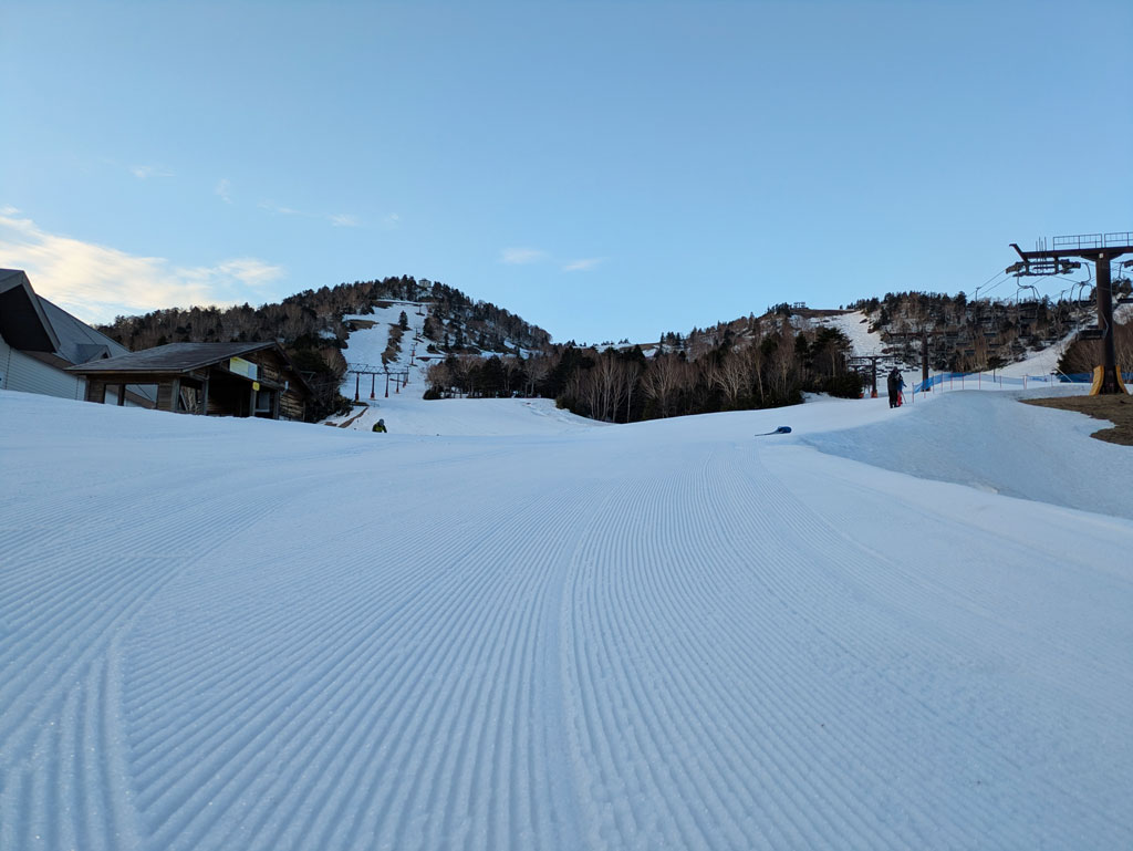 起きて晴れていて、スキー場のゲレンデの上に立って、パリッとカチカチのゲレンデでホッとしました(*^_^*)