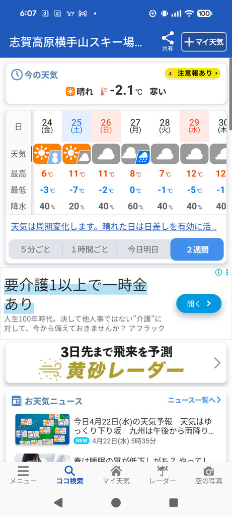 週間天気を見ると、「志賀高原」はゴールデンウイーク期間中は最低気温は例年よりも下がりそう!!